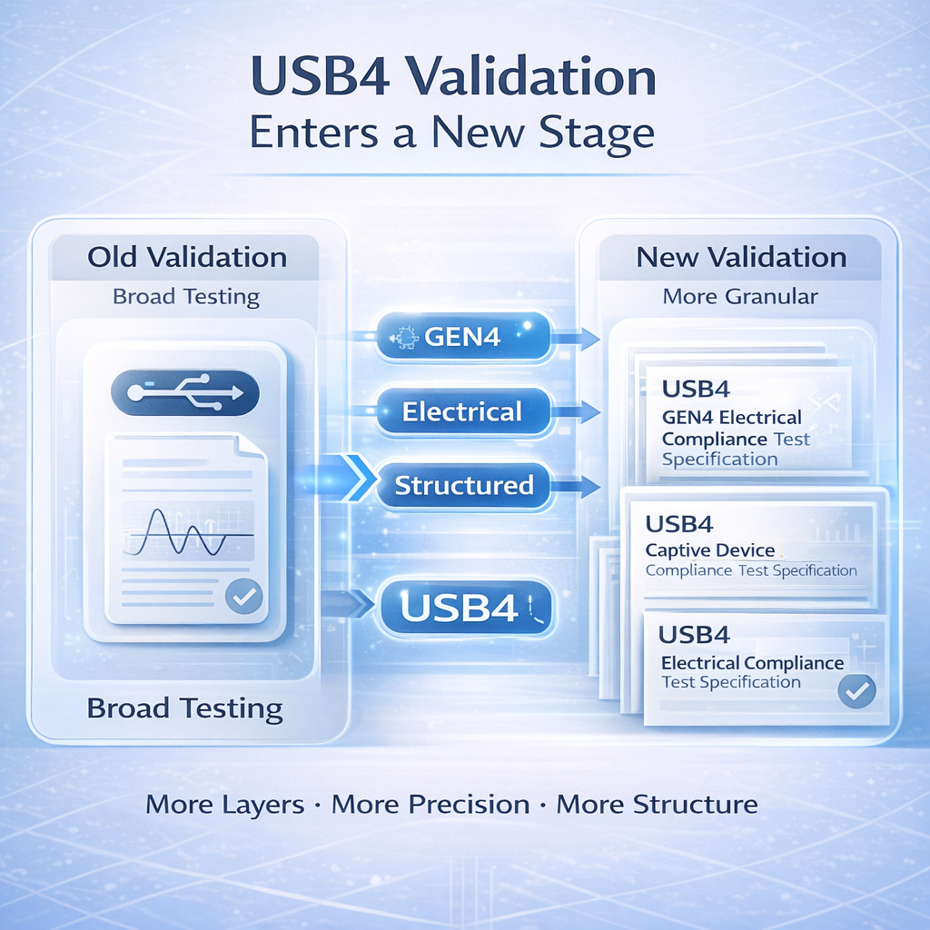 A February 2026 USB-IF document update shows that USB4 validation is becoming more segmented and more precise, with dedicated electrical compliance materials for newer performance levels and device categories.